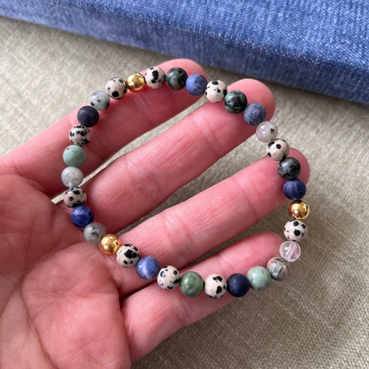 Et smukt armbånd som skiller sig lidt ud med de små plettede dalmatiner jaspis. Derudover er der i dette armbånd afriskanske turkiser, Lapis Lazuli, amazonit og en bjergkrystal.
