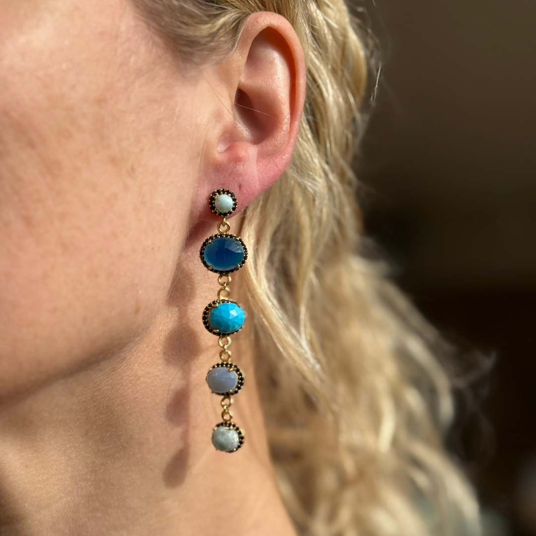 Extravagance No. 2 er et smykke, der indfanger havets dybde og himlens uendelighed i ét dragende udtryk. Ørehængeren forener nuancer af blå – fra den blide larimar og blå chalcedon til den intense turkis og glødende blå opal – hver sten indrammet af skinnende sorte spinel, der tilføjer kontrast, dramatik og sofistikation.