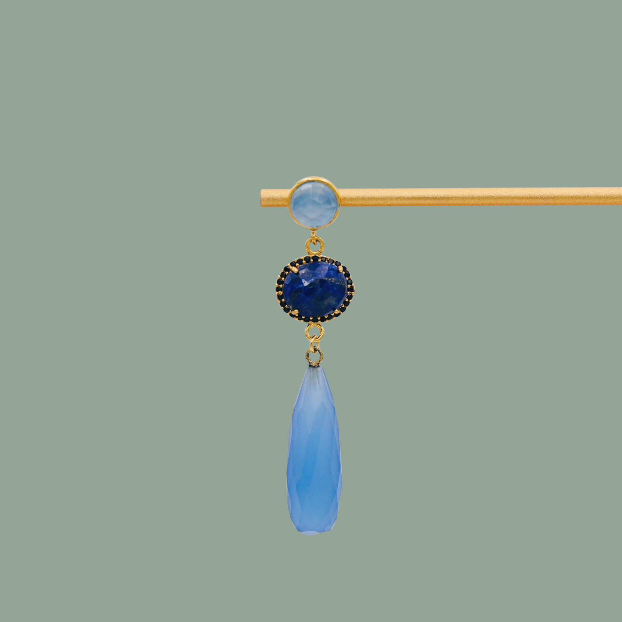 Et dragende smykke i kølige blå nuancer, hvor himmel møder hav. Øverst og nederst sidder blå chalcedon, der med sit let gennemsigtige, bløde skær tilfører et roligt og harmonisk udtryk. I midten glimter en dybblå lapis lazuli, indrammet af små sorte spinel, som giver ørehængeren kant og kontrast.