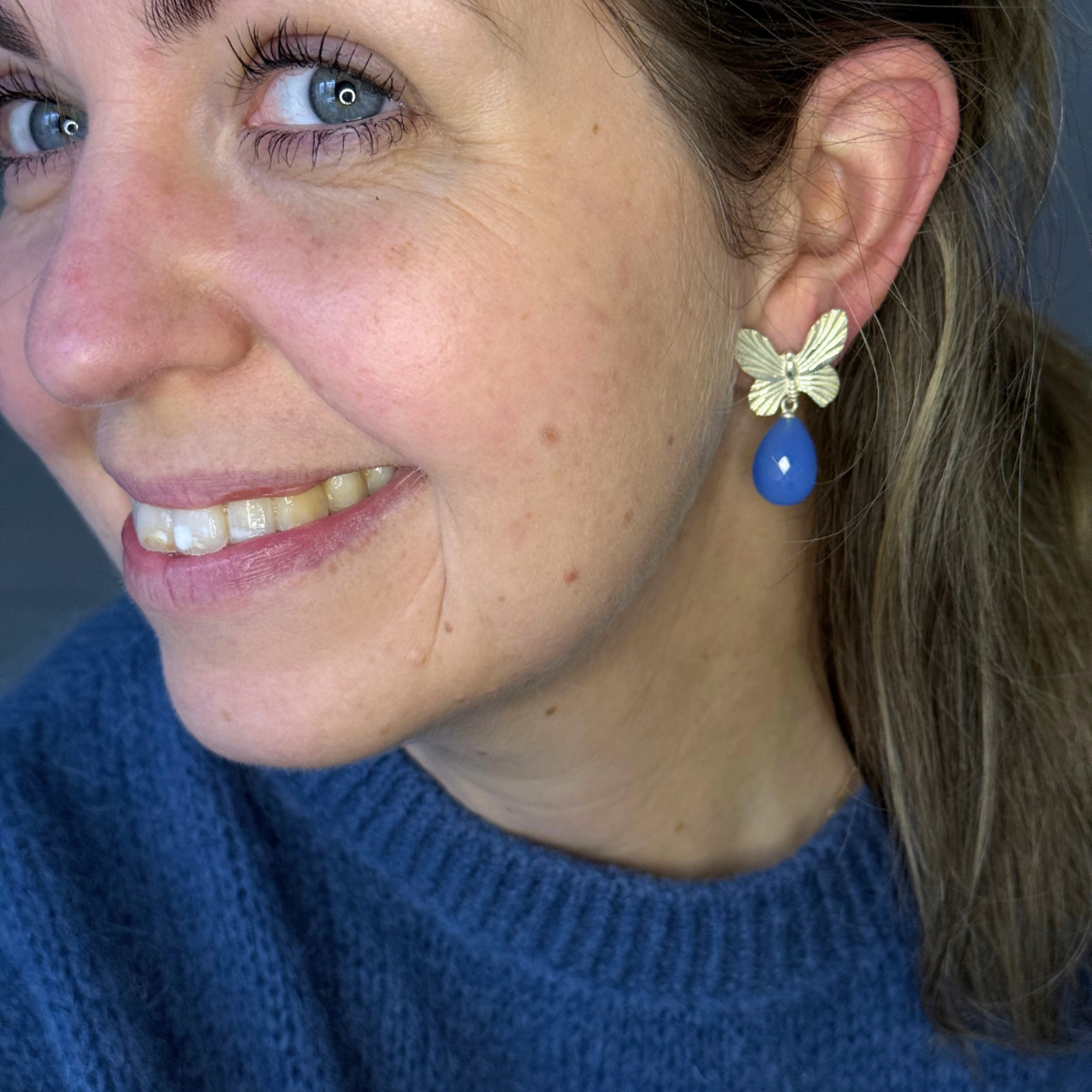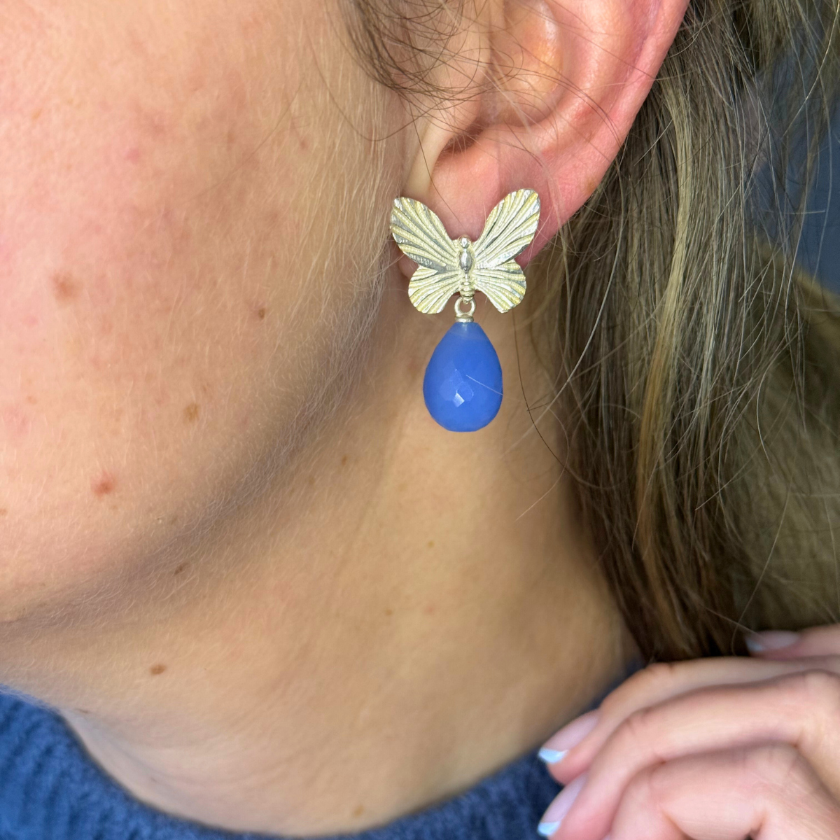 Under sommerfuglen hænger en facetteret, dråbeformet blå chalcedon, der tilfører smykket et blidt spil af lys og farve.