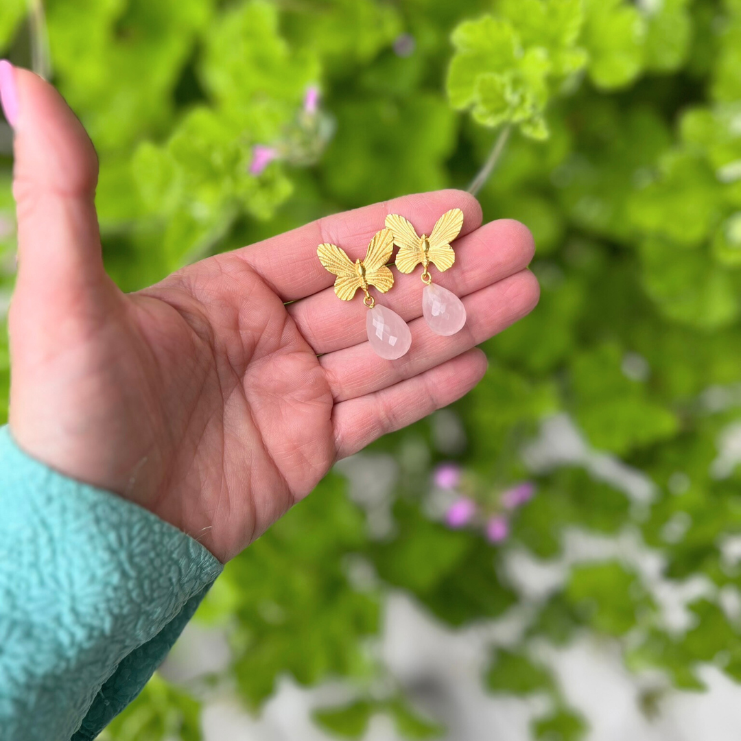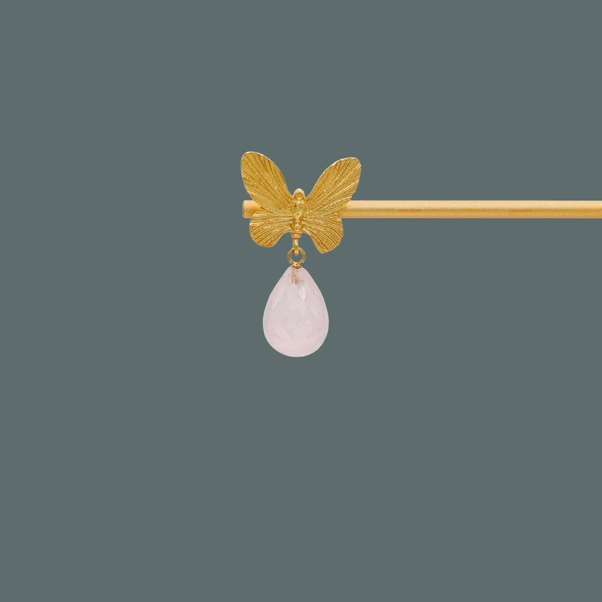 En elegant ørestik med en stor forgyldt sommerfugl i sterlingsølv, der symboliserer transformation, frihed og lethed. Sommerfuglen måler 2,3 × 1,8 cm (uden stenen) og skaber et feminint og iøjnefaldende udtryk. Under sommerfuglen hænger en dråbeformet rosakvarts, kendt som kærlighedens og blidhedens sten, der tilfører varme og et romantisk touch til smykket.