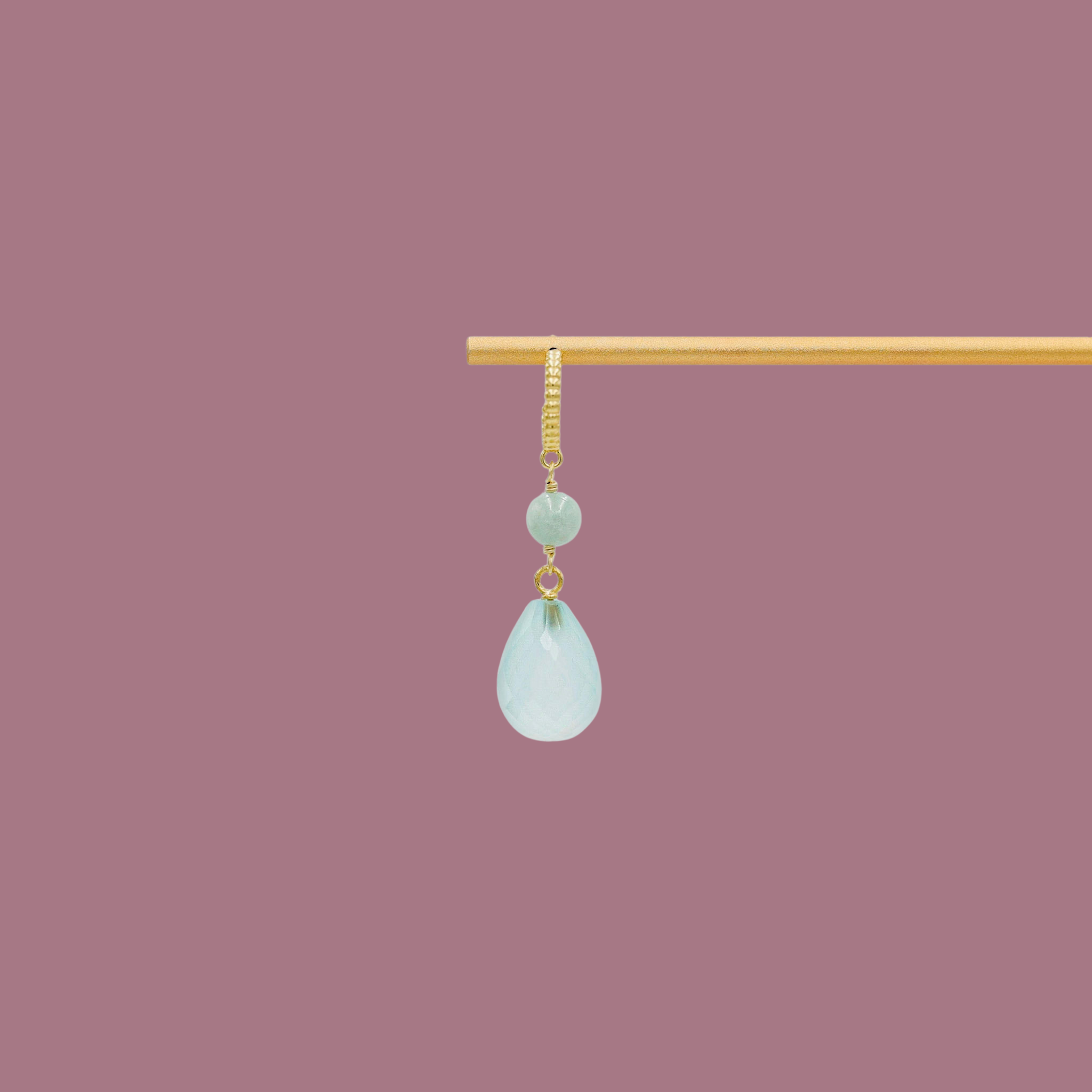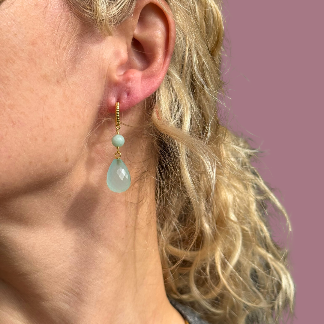 En frisk og elegant halvcreol med små kugler, der giver smykket et legende og sofistikeret udtryk. Under creolen hænger en rund amazonit-sten, kendt for sin beroligende energi og evne til at fremme balance og klarhed. Nederst ses en dråbeformet aqua chalcedon, som tilfører mildhed, harmoni og et subtilt touch af blågrøn skønhed.