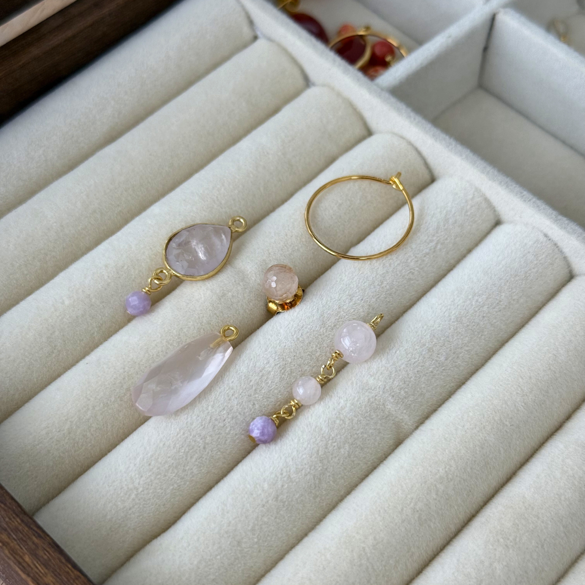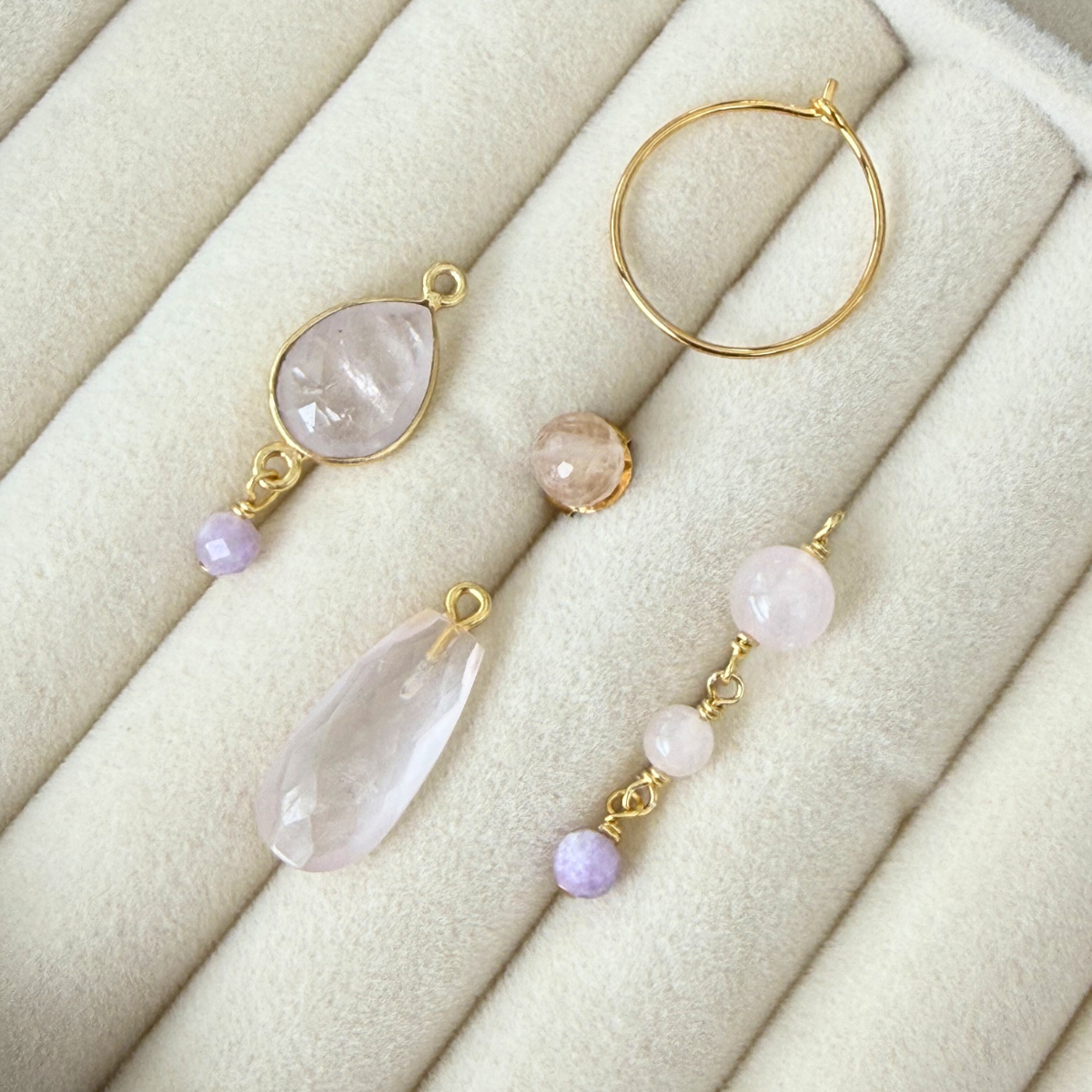En delikat og fin samling i svagt rosa nuancer. I dette sæt er rosakvarts den "bærende" sten. Derudover er der lepidolit.