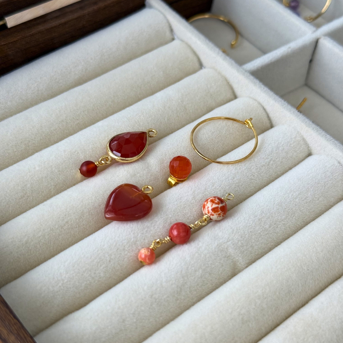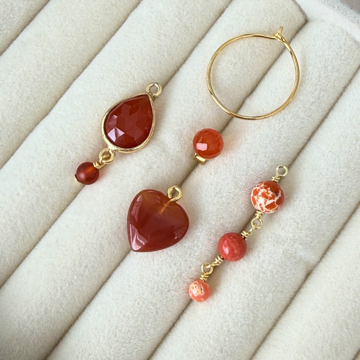 Et powerfuld og iøjnefaldende sæt med karneol som den primære sten. Derudver er der agat og koral i dette sæt