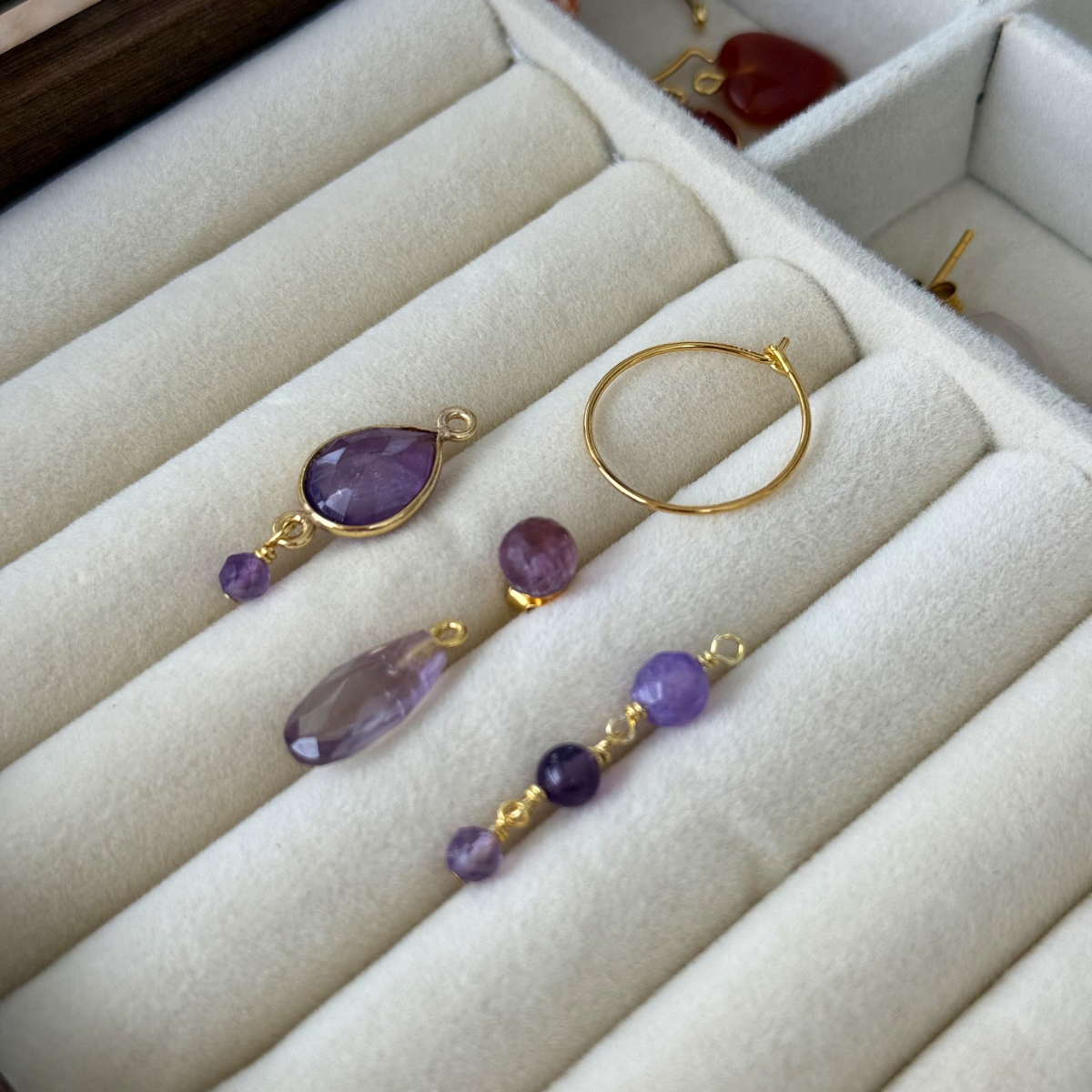Et mega smukt sæt i lilla - med ametyst i forskellige nuancer. Et sæt der vil være så smukt at kombinere med dine øvrige smykker med ametyst, som fx. Simple