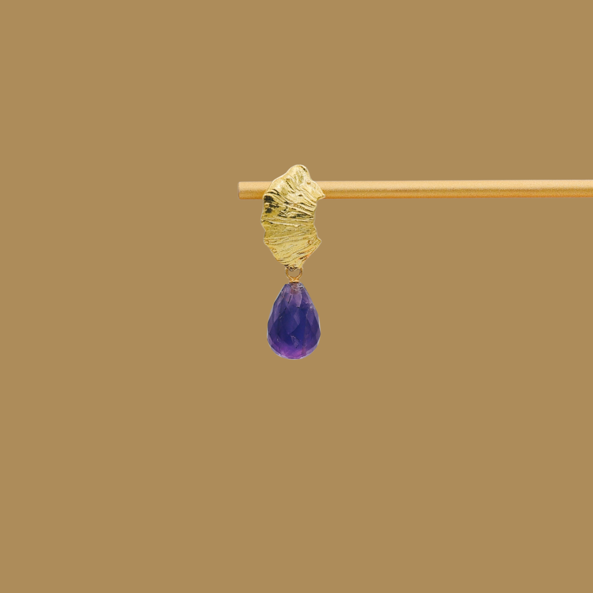 Et feminint smykke inspireret af naturens former. Leaf har en ørestik udformet som et blad, der sidder smukt på øret og giver et organisk, elegant udtryk. Fra bladet hænger en facetteret dråbeformet lilla ametyst på ca. 1,3 cm, som fanger lyset på fineste vis. Den samlede længde på øreringen er ca. 3,5 cm – et perfekt mål til både hverdagsbrug og særlige lejligheder.