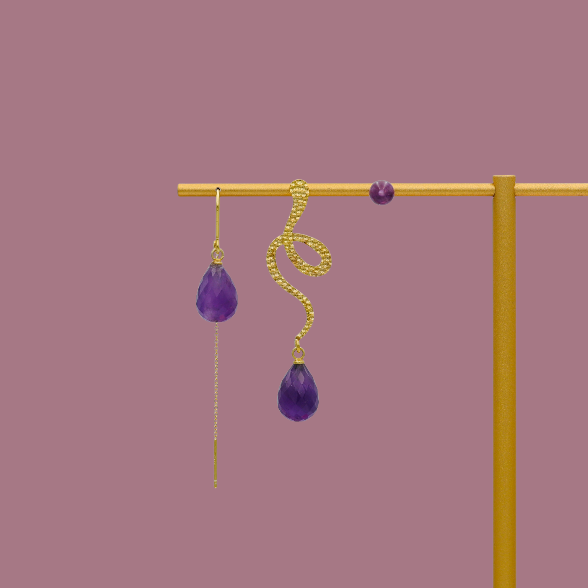 Et elegant og harmonisk sæt bestående af tre øresmykker i samme sten — Snake, Simple og MiniKIND. Hver style har sit eget udtryk, men den lilla ametyst binder dem sammen i et gennemført og tidløst helhedslook.