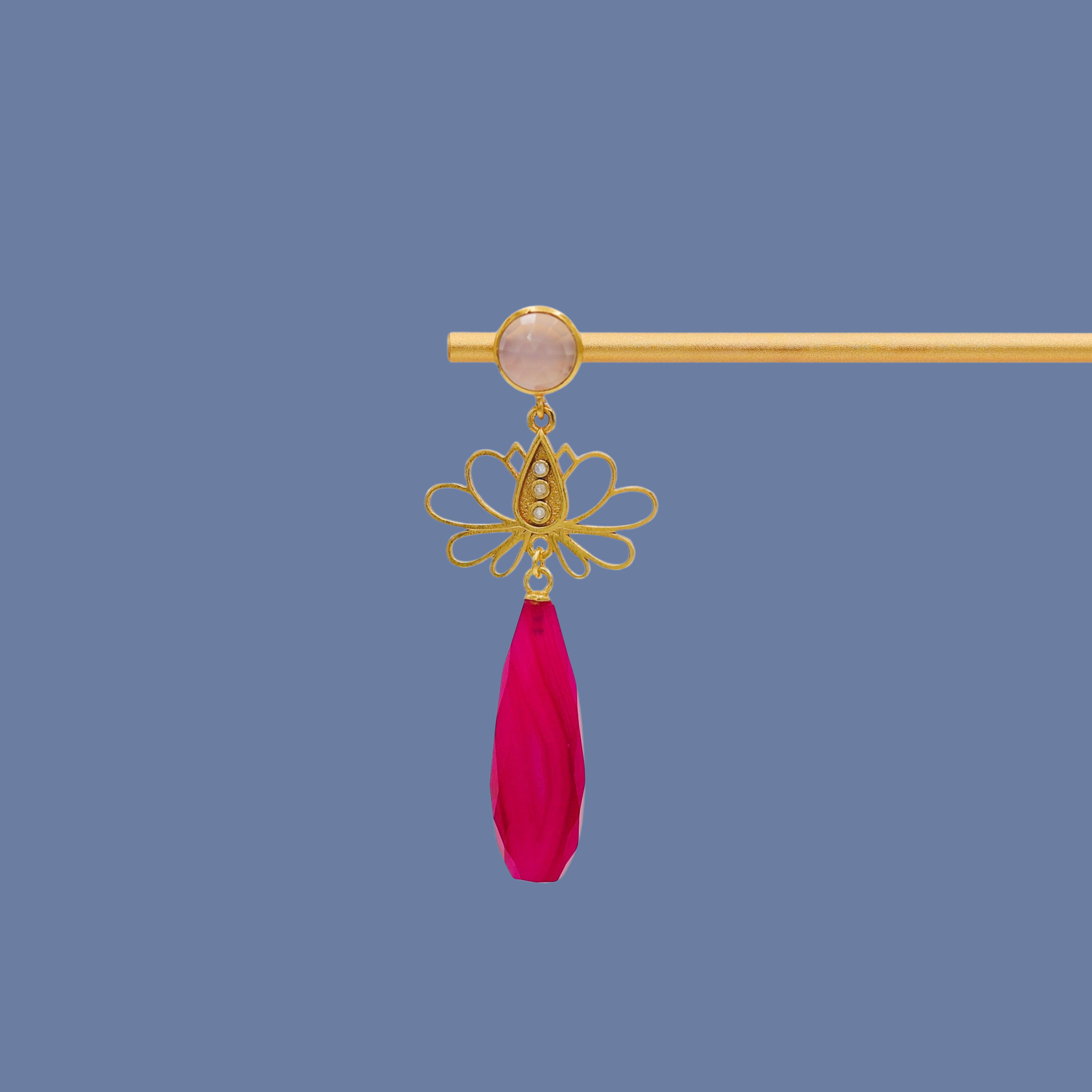 En smuk og elegant ørehænger, hvor ædelstenenes bløde nuancer mødes i et raffineret design. Øverst sidder en rund lavendel chalcedon på ca. 1 cm, der tilfører et feminint og harmonisk udtryk. Midten prydes af en delikat lotus med små glimtende månesten, som symboliserer renhed og spirituel vækst. Nederst hænger en lang dråbe af pink chalcedon, der tilfører varme, romantik og en iøjnefaldende elegance.