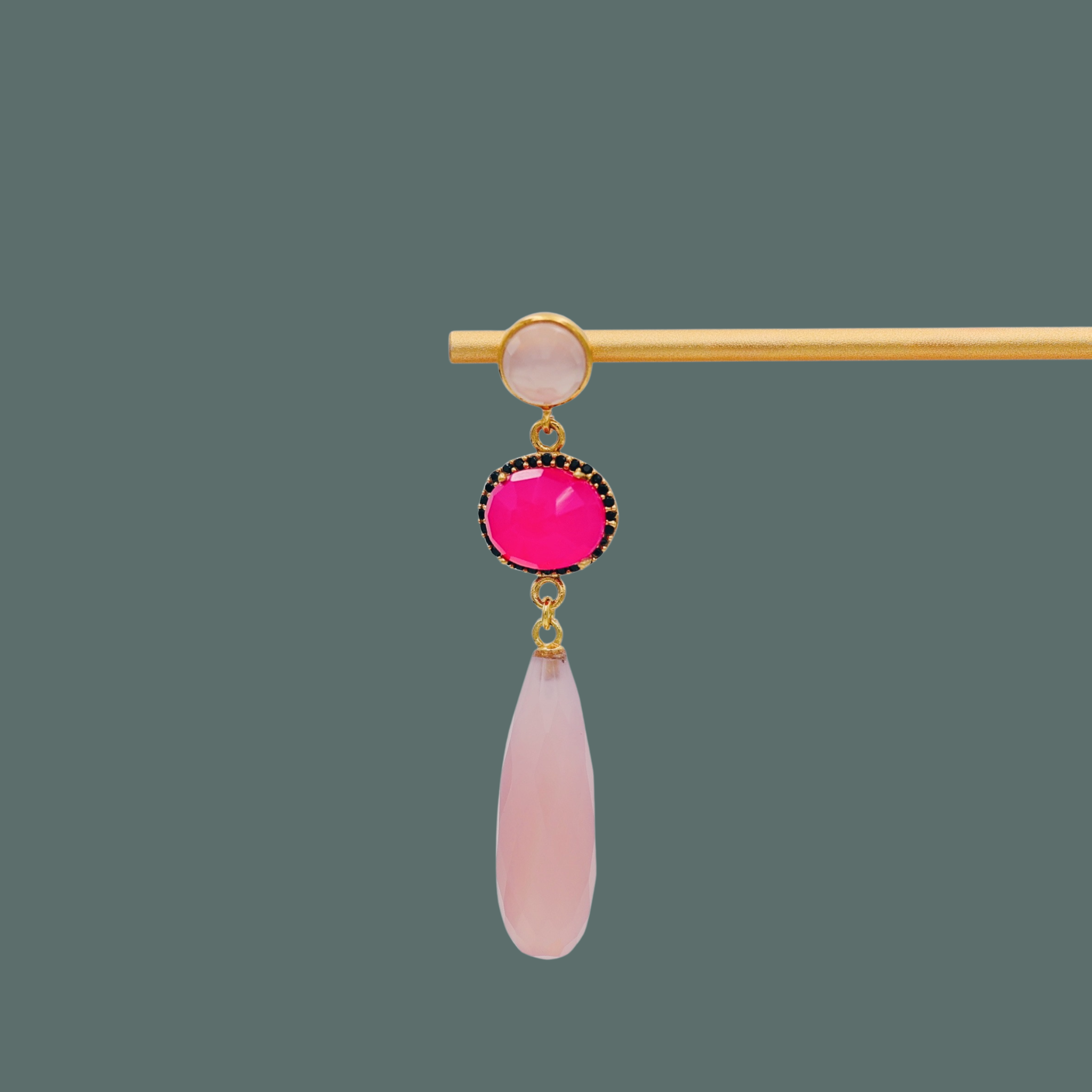 n elegant og farvemættet ørehænger, hvor lyse og mørke kontraster mødes i en harmonisk balance. Øverst og nederst sidder svagt rosafarvede chalcedoner, der tilfører et blødt og feminint udtryk. I midten fanger en klar pink chalcedon lyset med sin livlige glød – smukt indrammet af en cirkel af små sorte spinel, som tilfører dybde og kant.