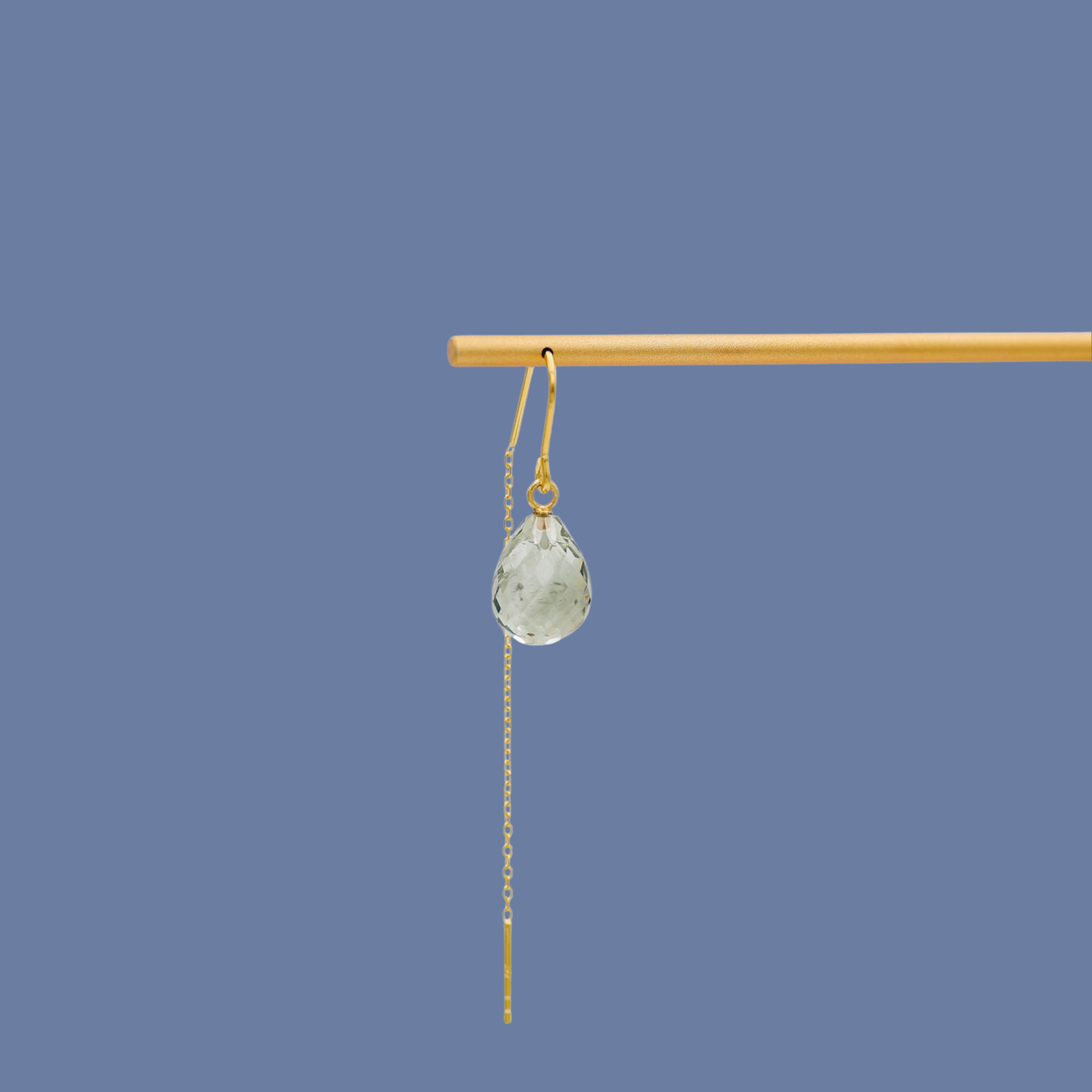 Et elegant og minimalistisk smykke med et moderne twist. Simple består af en farvet, facetteret dråbeformet grøn ametyst på ca. 1,3 cm, der hænger let i en slank bøjle. Bag øret fortsætter designet med en fin kæde, som sammen med bøjlen måler ca. 7,5 cm. Det giver ørehængeren et let og bevægeligt udtryk, der fanger lyset smukt, når du har den på.