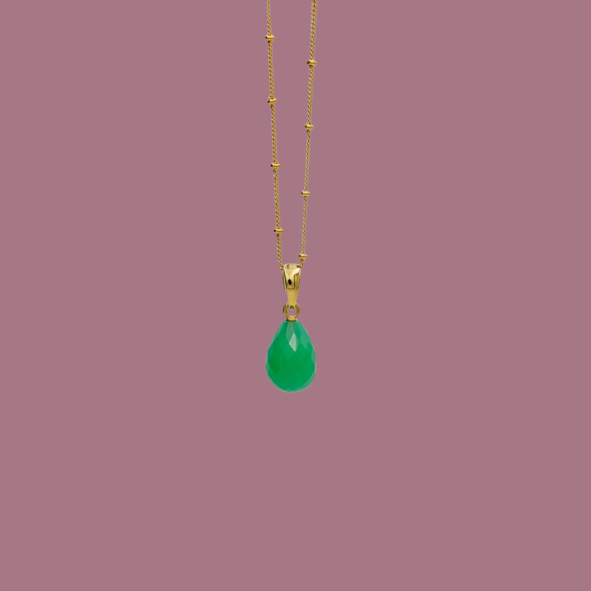 Et elegant og simpelt smykke med et moderne twist. Simple necklace består af en facetteret, dråbeformet chrysopras på ca. 1,3 cm, der hænger i et smukt øsken.