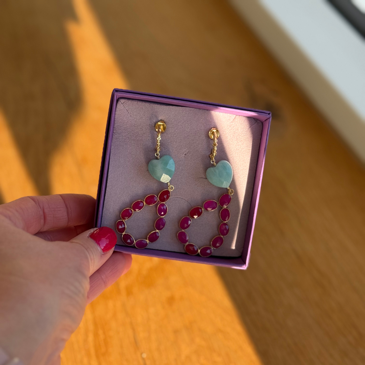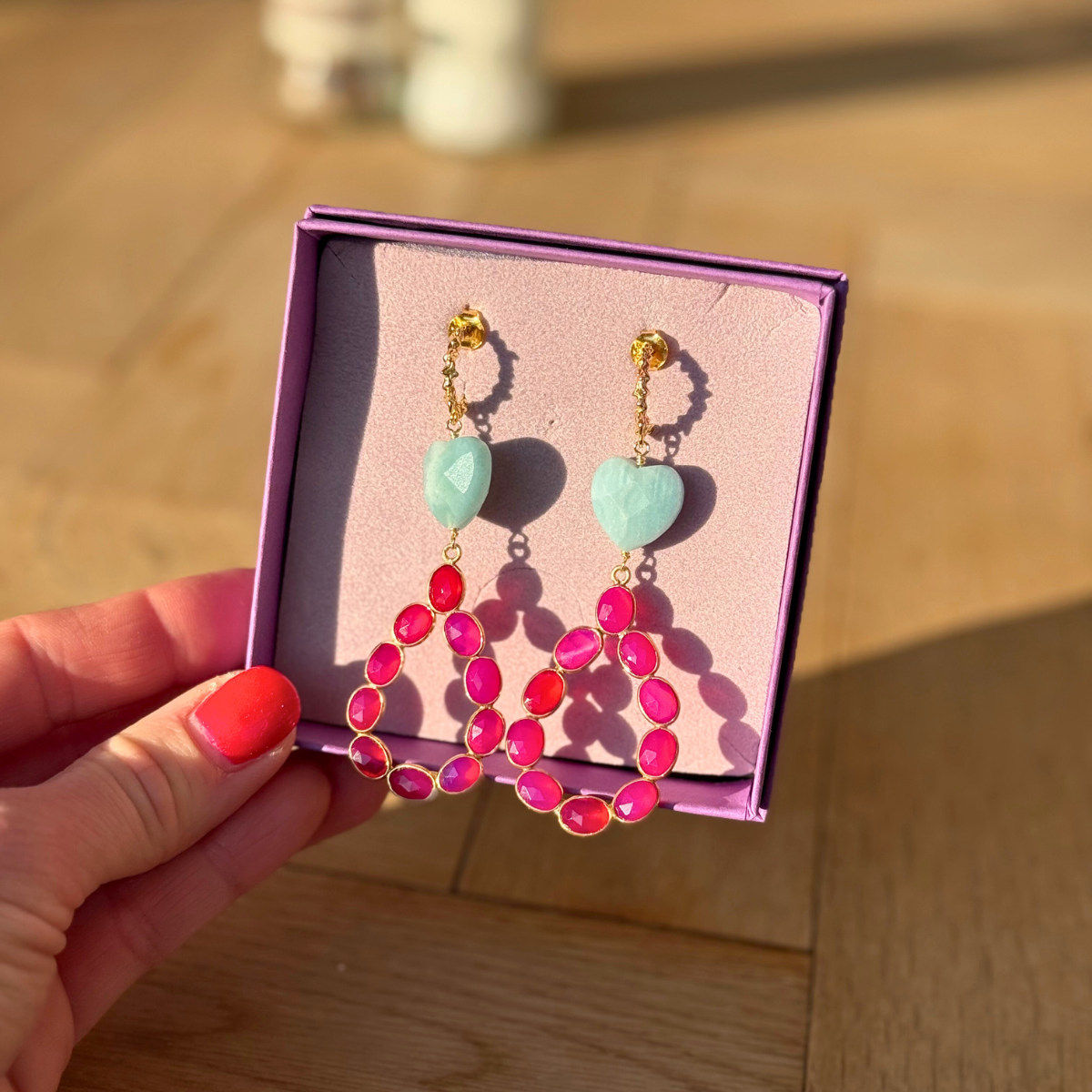 Wauw - det beskriver vidst meget godt hvad du får med dette sæt øreringe. Det indeholder fine amazonithjerter og dråber med nogle helt magiske pink chalcedoner. I toppen sidder en halvcreol med en rustik overflade.