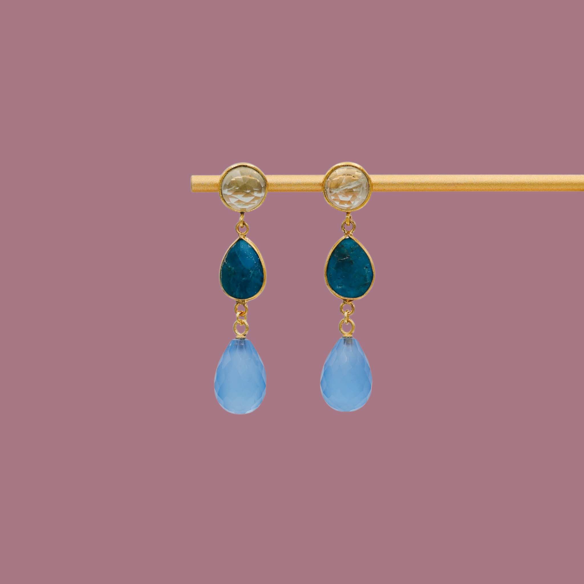 Grøn ametyst forbindes med indre ro og fornyelse, apatit symboliserer inspiration og klarhed, mens blå chalcedon bringer fred og balance. Sammen udstråler de en naturlig harmoni, der løfter både sind og stil.