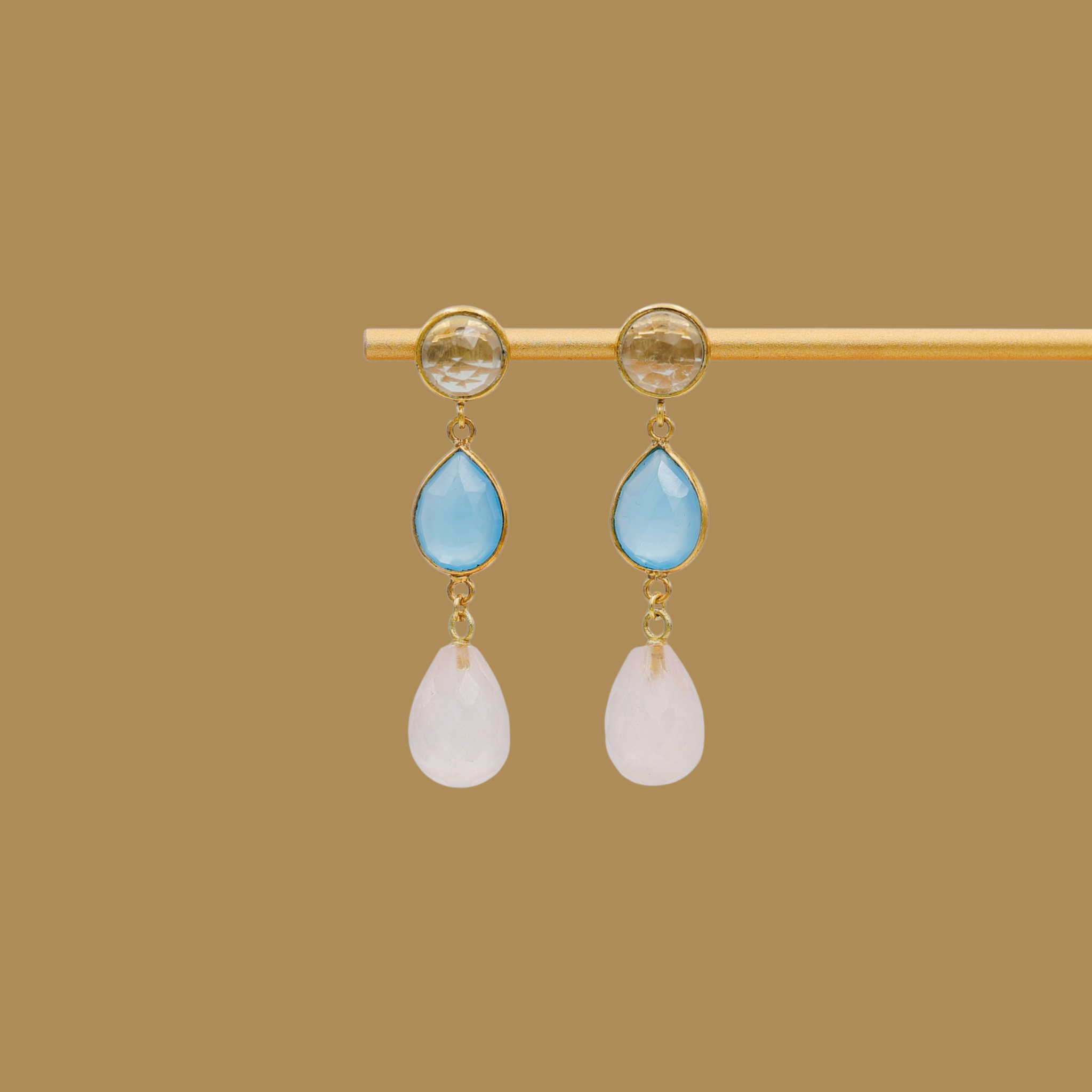 Et blødt og afbalanceret sæt fra Cirkus-kollektionen, hvor grøn ametysts klare ro, blå chalcedons lette friskhed og rosakvartsens kærlige varme mødes i et harmonisk farvespil. Farverne bevæger sig mellem det kølige og det blide – et udtryk af naturlig balance og stille elegance.