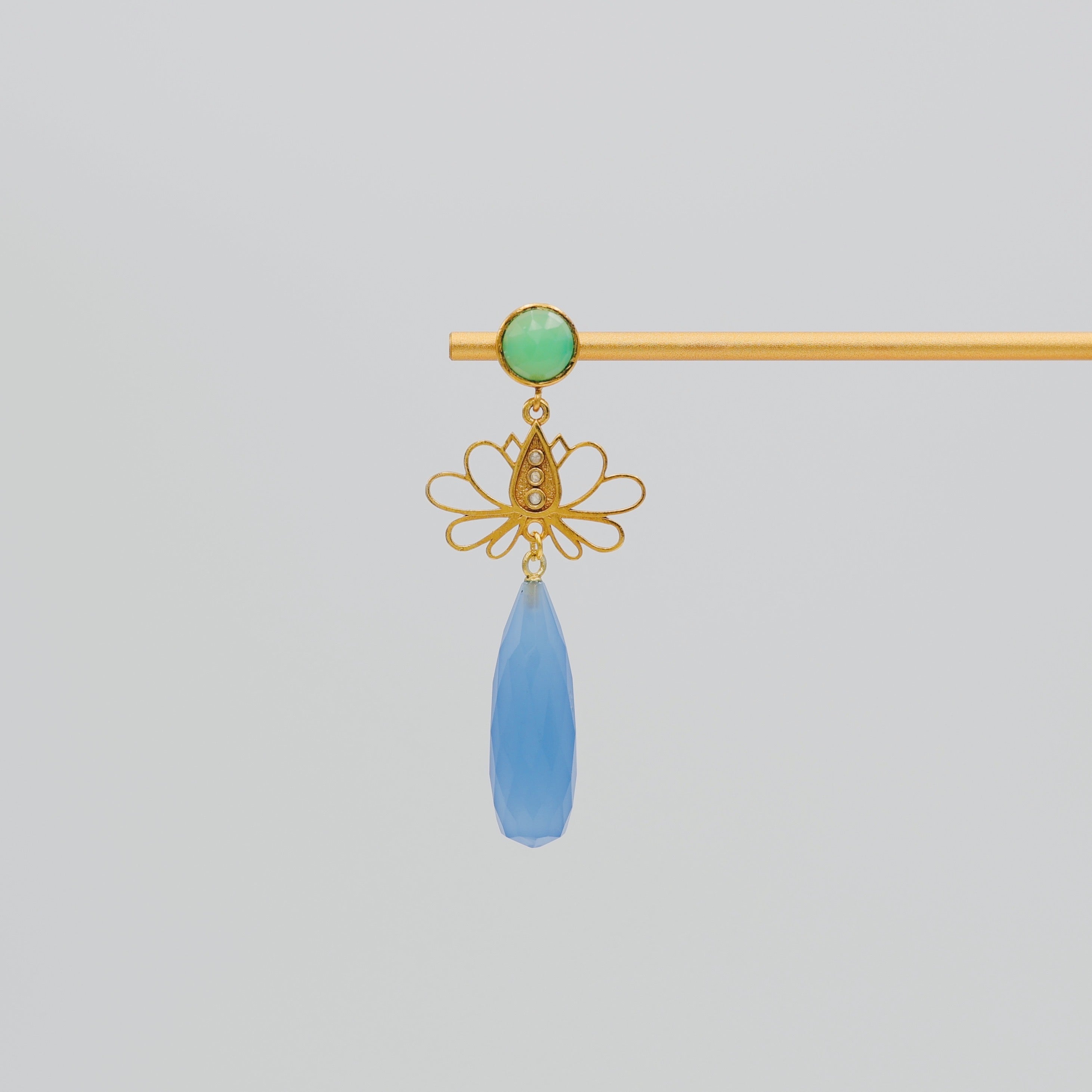 En raffineret og harmonisk ørehænger, hvor grønne nuancer mødes i et elegant design. Øverst sidder en rund prehnit på ca. 1 cm, kendt for sin blide energi og evne til at skabe ro og balance. Midten prydes af en lotus med små glimtende månesten, som symboliserer spirituel vækst og indre styrke. Nederst fuldendes smykket af en dråbeformet chrysopras, der tilfører friskhed, håb og et naturligt farvespil.