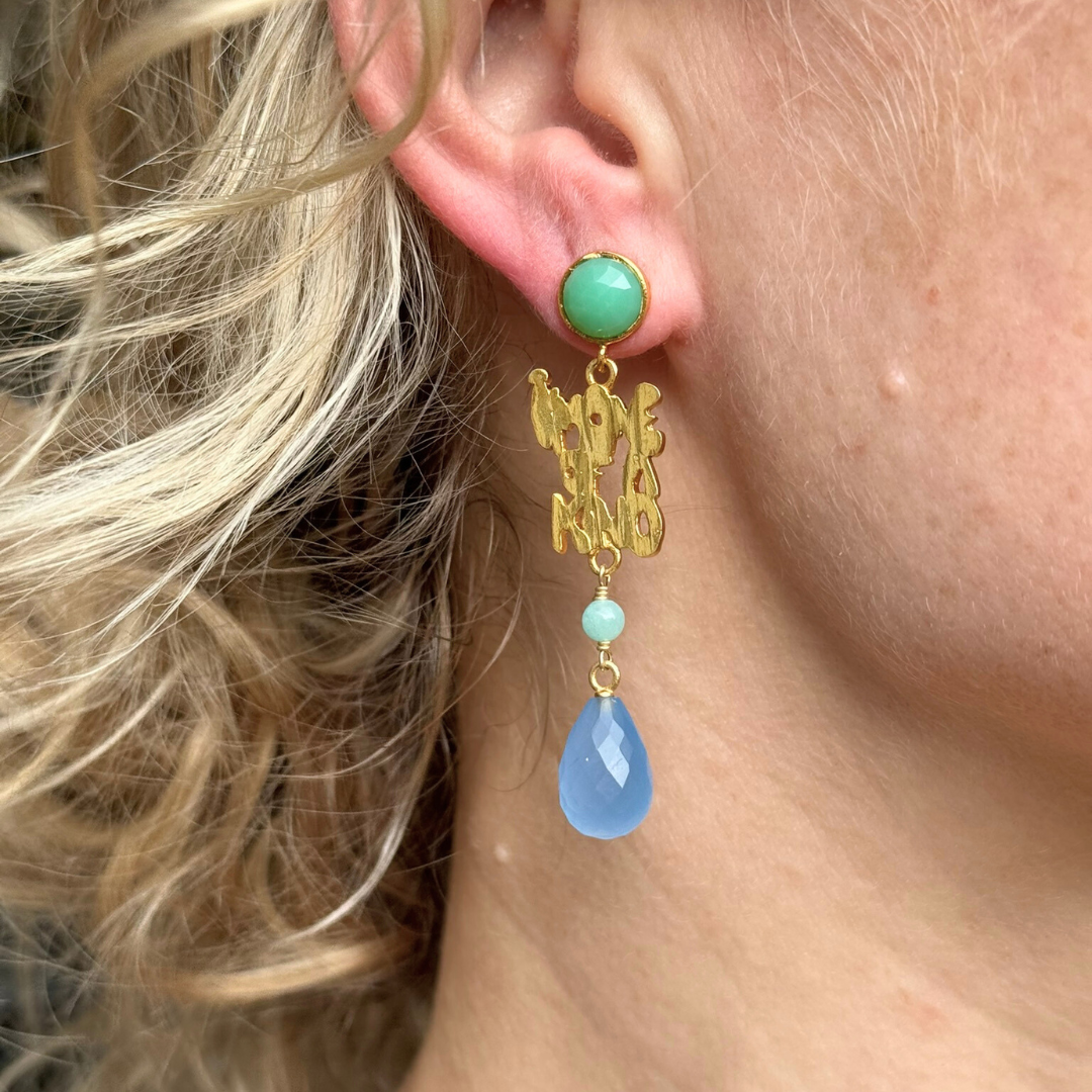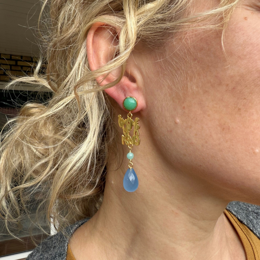 Et smykke, der skiller sig ud med både design og budskab. Ørestikken måler 1 cm i diameter og prydes af chrysopras, der giver en frisk, grøn glød. Under stenen hænger et håndtegnet led med teksten “I’m One of a Kind”, som gør hver ørering unik. Små detaljer i form af amazonit og en dråbeformet blå chalcedon skaber et subtilt, levende farvespil og tilfører elegance til designet.