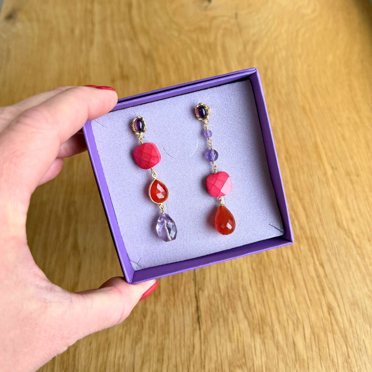 Et lækkert sæt i pink, orange og lilla. Stenene jeg har brugt er karneol, jade og ametyst. Dette unika sæt er lavet så det passer perfekt sammen selvom det er to forskellige øreringe. Oplagt til dig, der er vild med det asymmetriske.