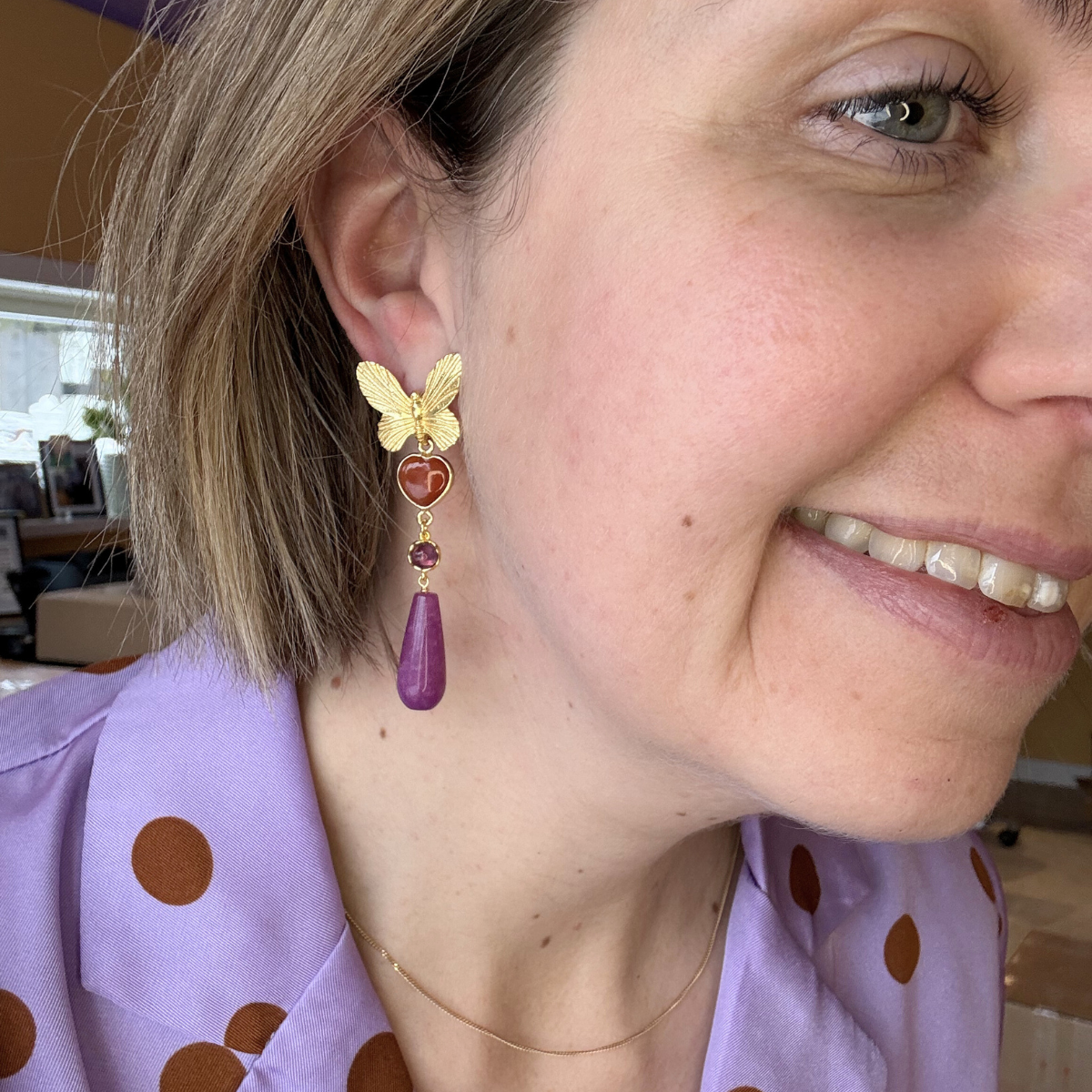 Et meget smukt sæt med et strejf af romantik. Sættet indeholder en flot stor sommerfugl og derunder hænger et karneol hjerte, en lille lilla ametyst og i bunden en dråbe af jade
