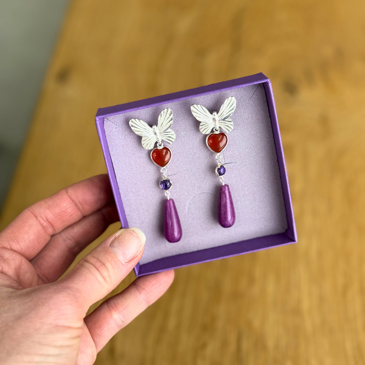 Et meget smukt sæt med et strejf af romantik. Sættet indeholder en flot stor sommerfugl og derunder hænger et karneol hjerte, en lille lilla ametyst og i bunden en dråbe af jade