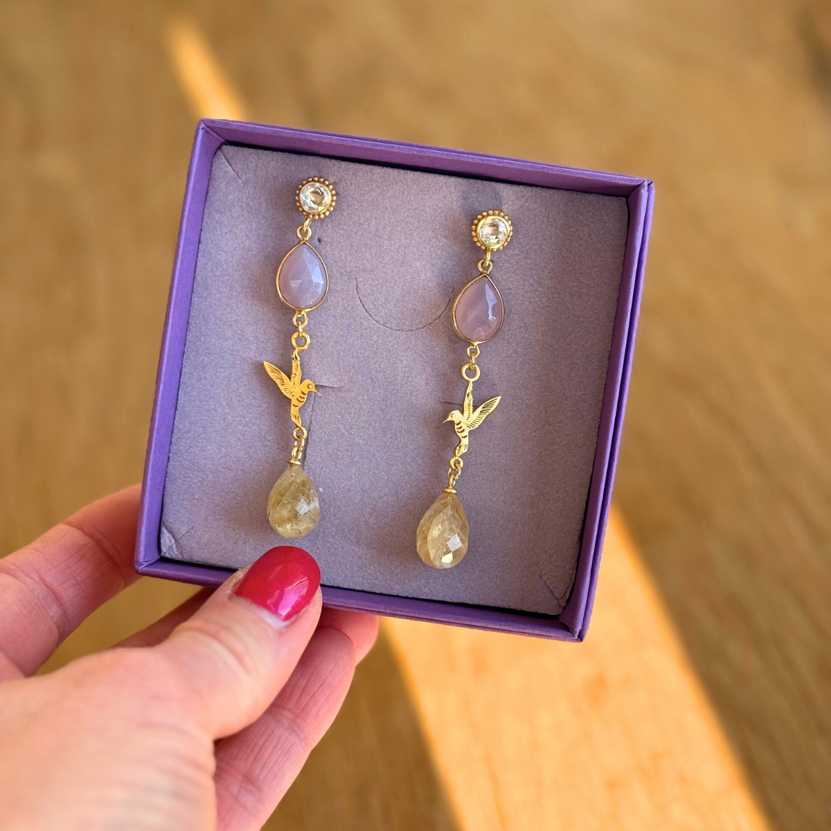 Da jeg arbejder med ægte sten er det meget svært at lave to ens øreringe, medmindre jeg har dem liggende foran mig. Der kan være variationer i farver og strukturer som gør det svært. Jeg vil altid gøre mit bedste, men send mig en besked, hvis du tidligere har bestilt et smykke og ønsker et magen til.