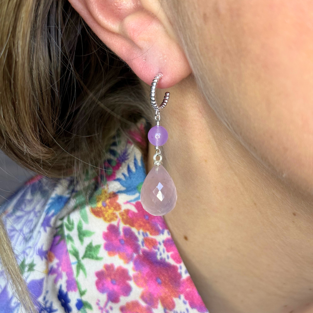 En smuk og elegant halvcreol med små kugler, der giver smykket et let og sofistikeret udtryk. Under creolen hænger en rund jade, kendt for sin harmoniserende energi og evne til at fremme balance og velvære. Nederst afsluttes smykket med en dråbeformet rosakvarts, der symboliserer kærlighed, blidhed og positiv energi.