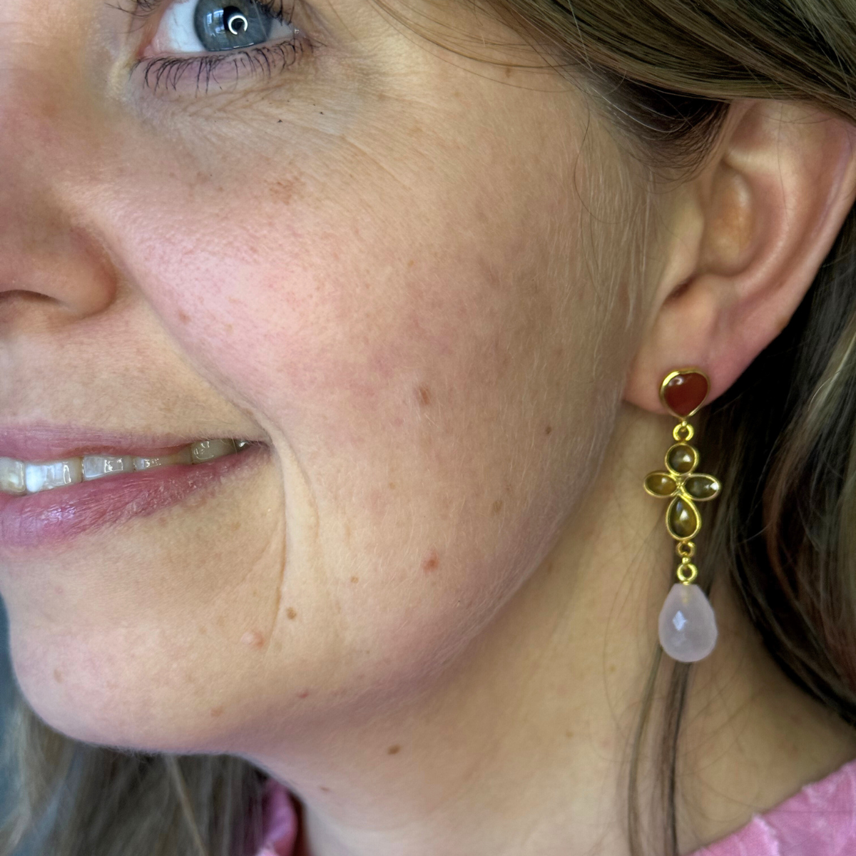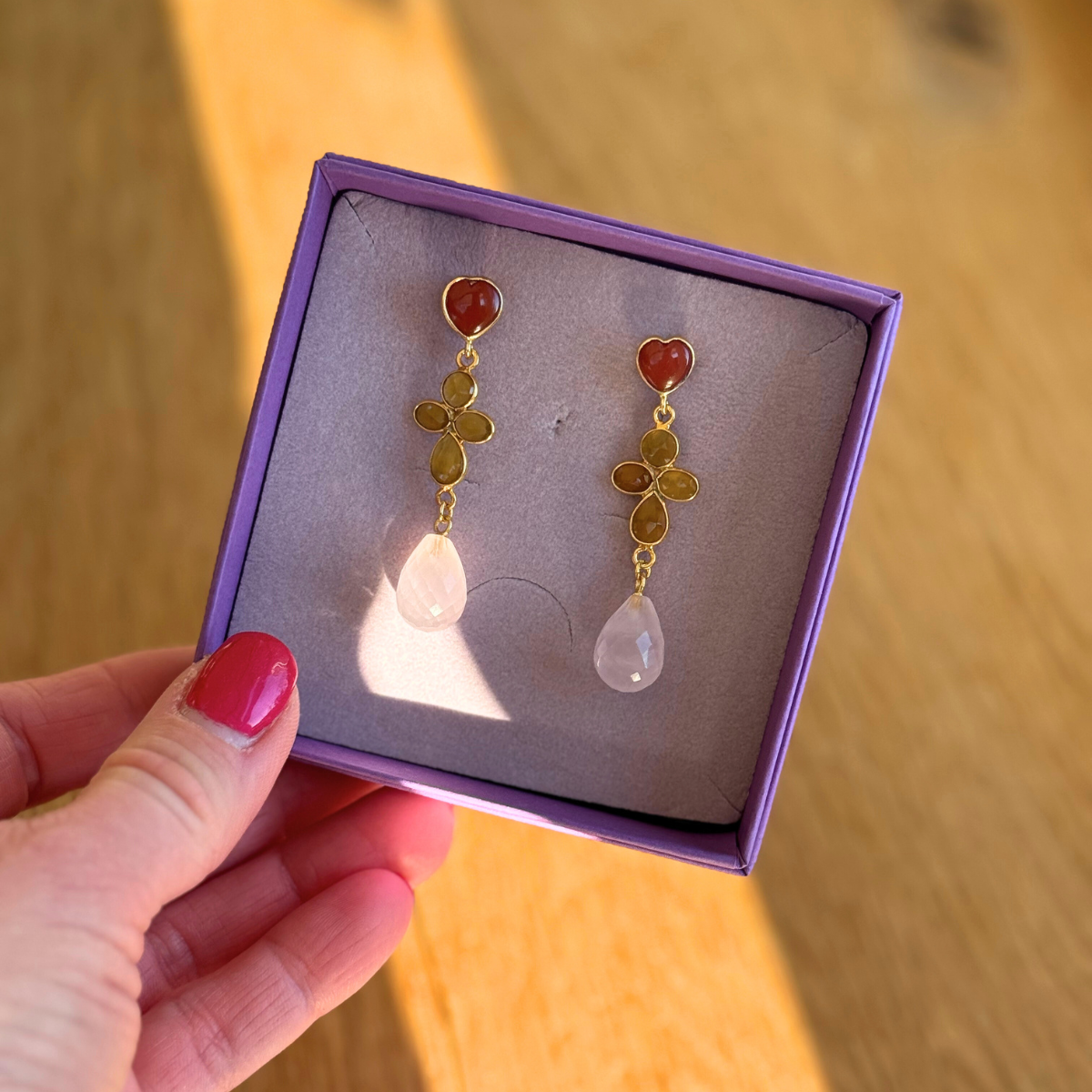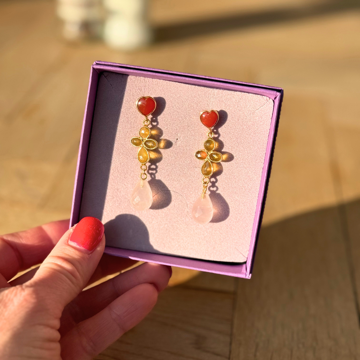 Et meget smukt sæt til dig, der gerne vil have et sæt øreringe, der ikke er så lange. De indeholder rød onyx, gul chalcedon og rosakvarts. Et harmonisk sæt med anvendelige farver.