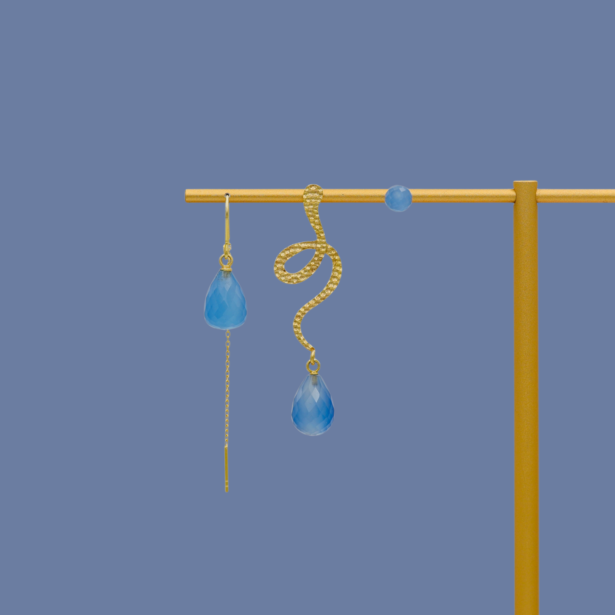 Et roligt og elegant sæt bestående af tre øresmykker i samme sten — Snake, Simple og MiniKIND. Hver style har sit eget udtryk, men den blå chalcedon samler dem i et blødt og harmonisk helhedslook.