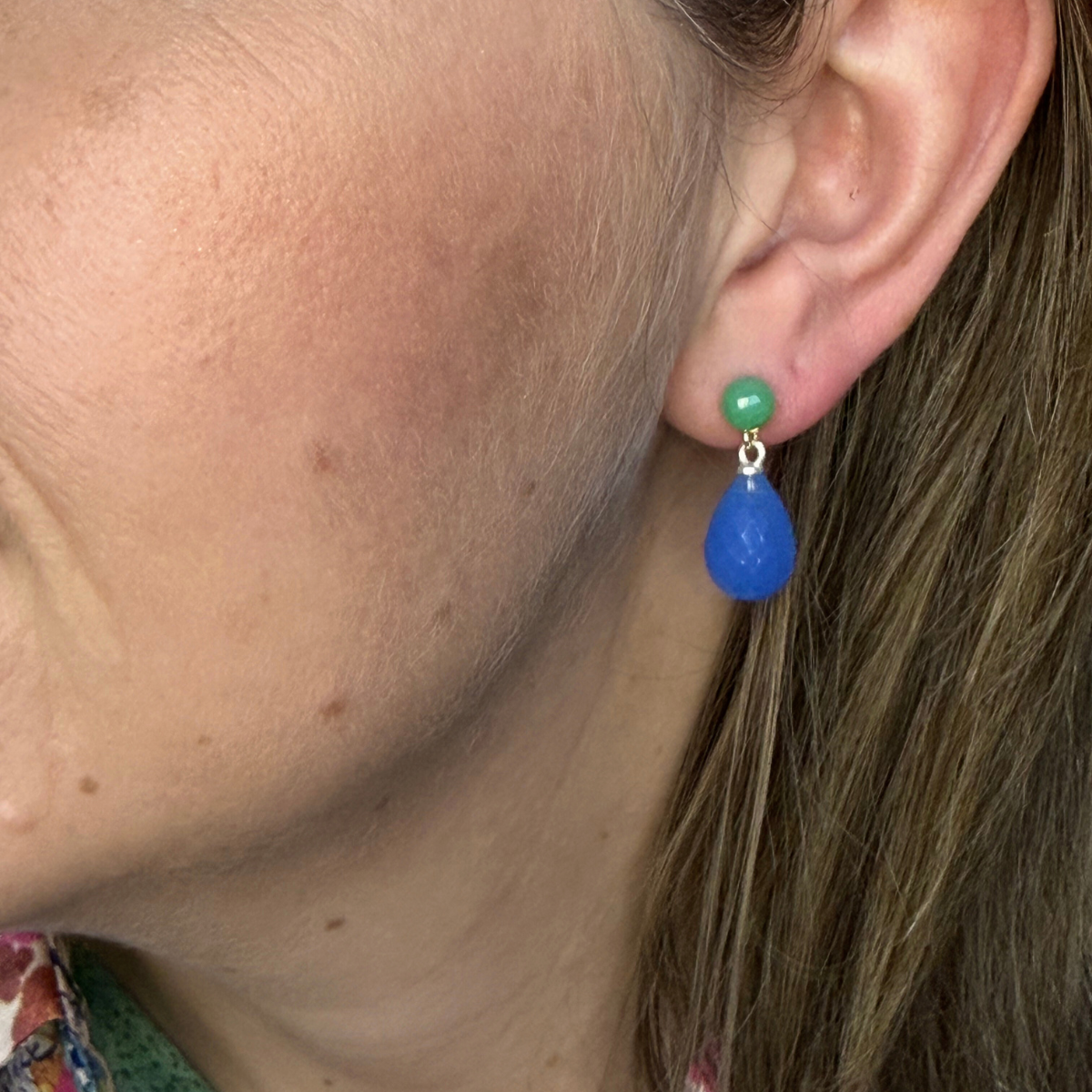 En frisk og livlig ørehænger med et klart og moderne farvespil. Øverst sidder en chrysopras i en intens, skrigende grøn nuance, der tilfører energi og kant til designet. Herfra hænger en dråbeformet blå chalcedon, hvis kølige, facetterede overflade balancerer det grønne med et roligt, næsten himmelblåt skær.