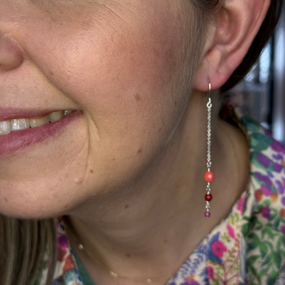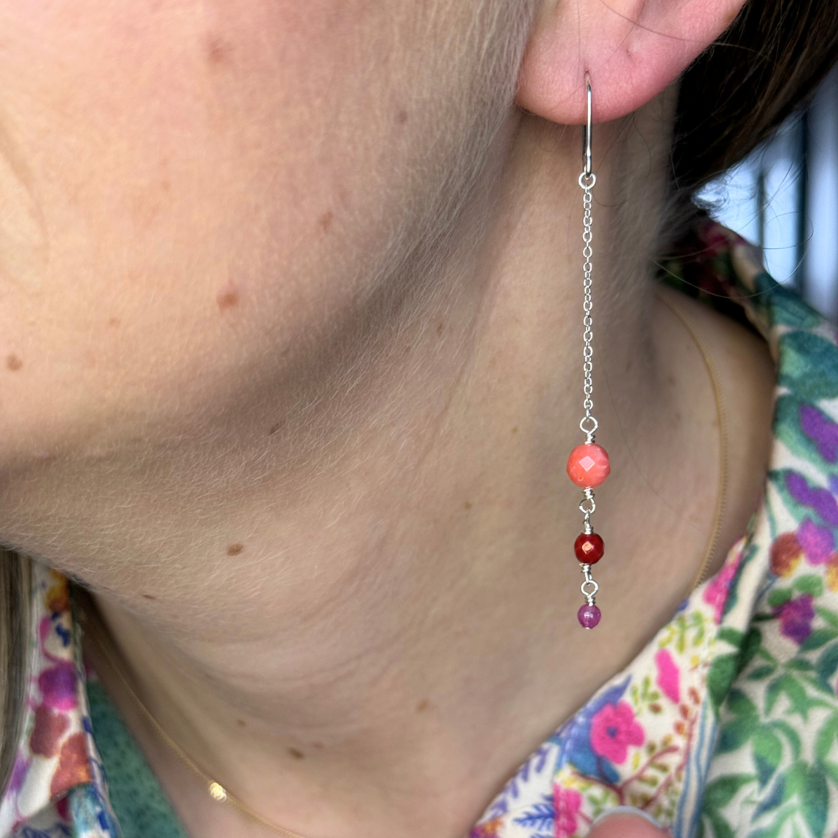 En livlig og feminin ørehænger, der emmer af varme og lethed. Smykket består af en fin guldkæde, hvor tre ædelstensperler i røde og pink nuancer hænger i smuk harmoni. Øverst ses en koral i blød ferskenrød tone, efterfulgt af en dybere, vinrød koral, og nederst en pink agat, der tilføjer et strejf af klarhed og glans.